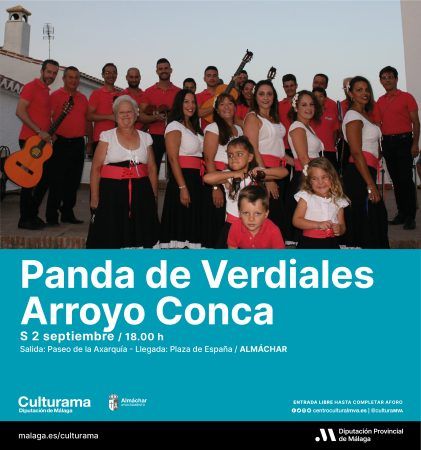 El sábado 2 de septiembre será el turno de la panda de verdiales ‘Arroyo Conca’, estilo Comares, que formará parte de las actividades relacionadas con la 53º edición de la Fiesta del Ajoblanco de Almáchar, declarada de Singularidad Turística de la Provincia por la Diputación de Málaga. La panda realizará un recorrido que comenzará en el Paseo de la Axarquía las 18:00 horas para finalizar en la Plaza de España.