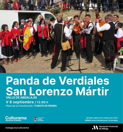 El municipio de Fuente de Piedra con motivo de sus fiestas patronales en honor a la Ntra. Sra. de las Virtudes acogerá entre sus actividades culturales la actuación musical de la panda de verdiales ‘San Lorenzo Mártir’, estilo Almogía, el día 8 de septiembre en la Plaza de la Constitución a partir de las 12.00 horas.
