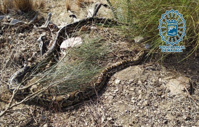 Agentes del Grupo de Protección de la Naturaleza (GRUPRONA) de la Policía Local de Málaga, con la ayuda de un Guarda Rural de los Montes de Málaga, han capturado para su recuperación una serpiente de gran tamaño de raza pitón molurus.
