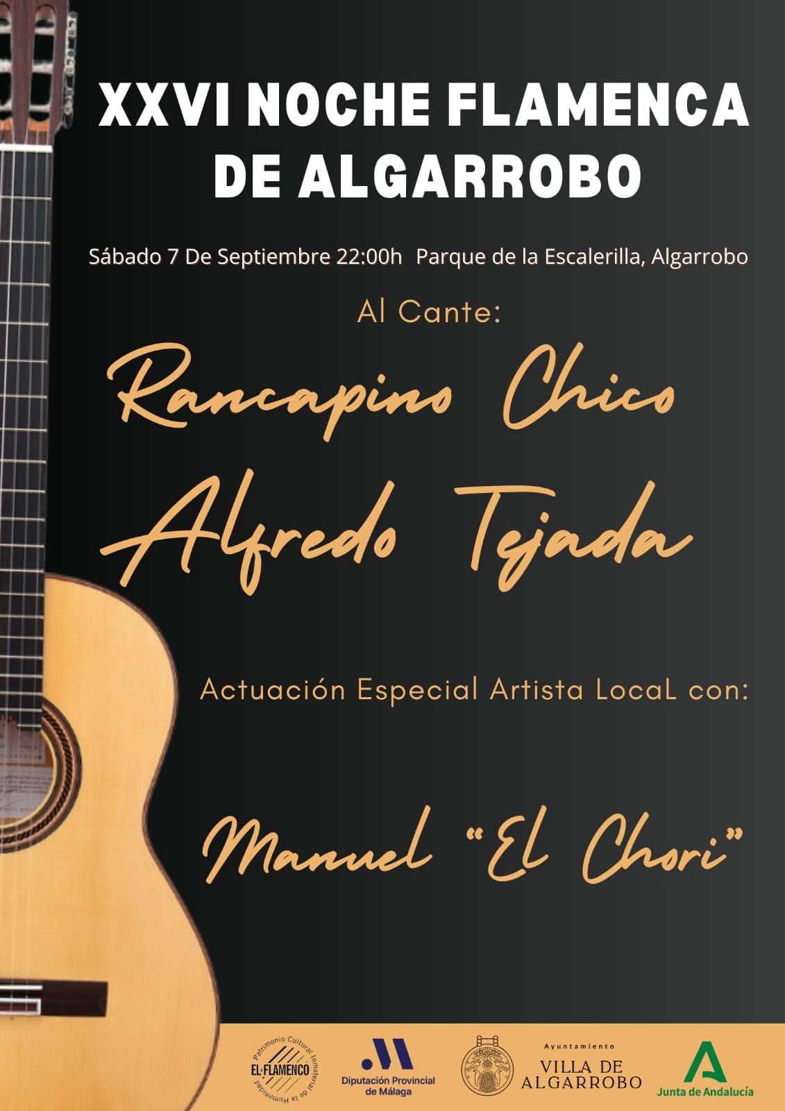 La XXVI Noche Flamenca de Algarrobo tendrá lugar el sábado, 7 de septiembre, en el Parque de la Escalerilla y será presentado, como en ediciones anteriores, por Antonio Guerra. El cartel estará compuesto por Rancapino Chico y Alfredo Tejada al cante y contará con la actuación especial del artista local Manuel ‘El Chori’.