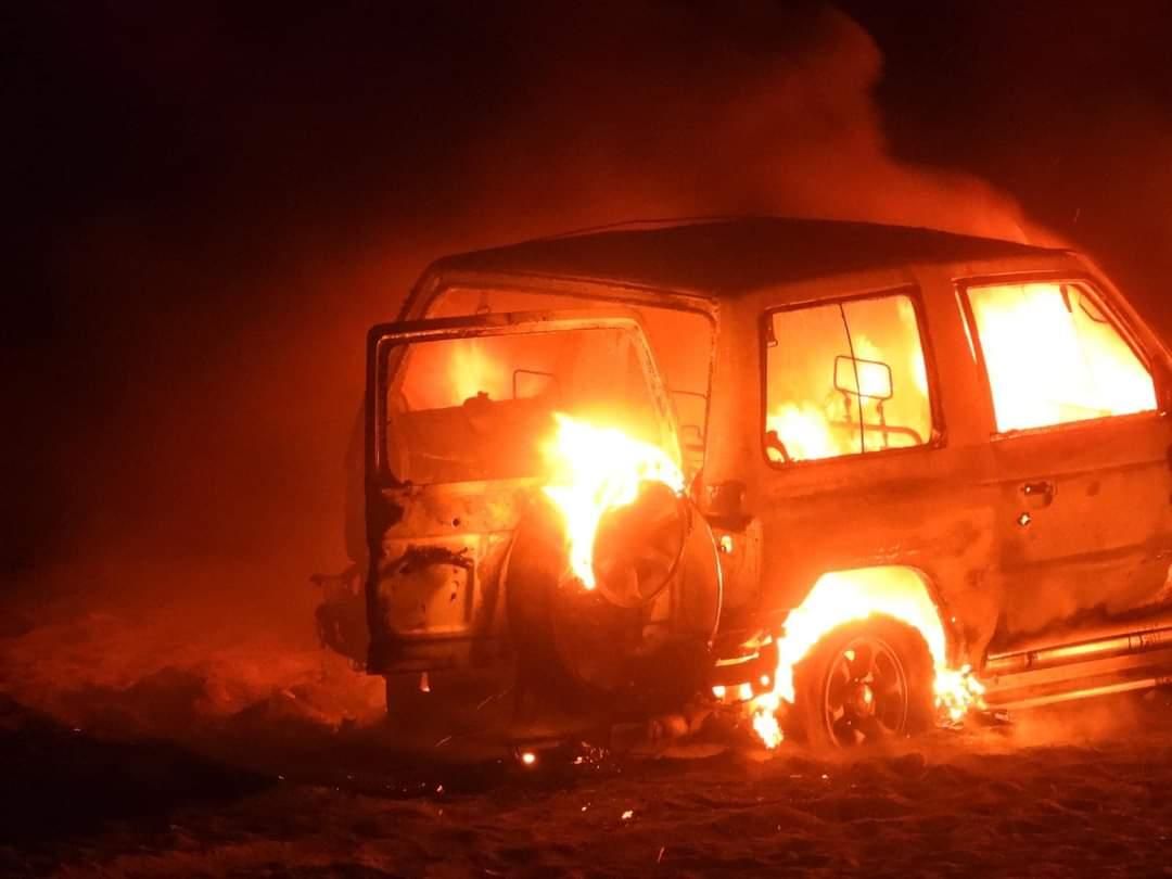 Al no conseguir introducir la narcolancha en el mar, los responsables decidieron prender fuego a la embarcación y a los dos vehículos