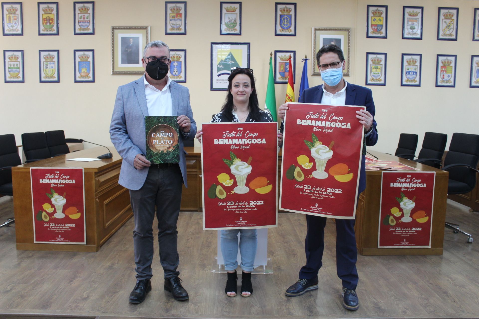El presidente de la Mancomunidad de Municipios de la Costa del Sol Axarquía, José Juan Jiménez; el portavoz institucional, Antonio Sánchez; y la vocal de Turismo del Ayuntamiento de Benamargosa, Isabel Arcas, han presentado esta mañana la XVII edición del Día del Campo que tendrá lugar este sábado 23 de abril