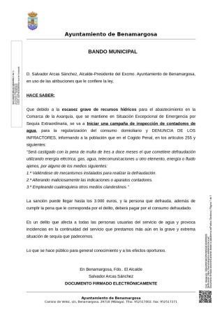 Con el objetivo de garantizar el abastecimiento de agua, Benamargosa se vio en la obligación de llevar a cabo cortes de suministro nocturnos, entre las 21.00 y las 9.00 horas, hasta que los depósitos recuperen agua. Ahora, se va a iniciar una campaña de inspección de contadores de agua, para la regularización del consumo domiciliario y denuncia de los infractores.