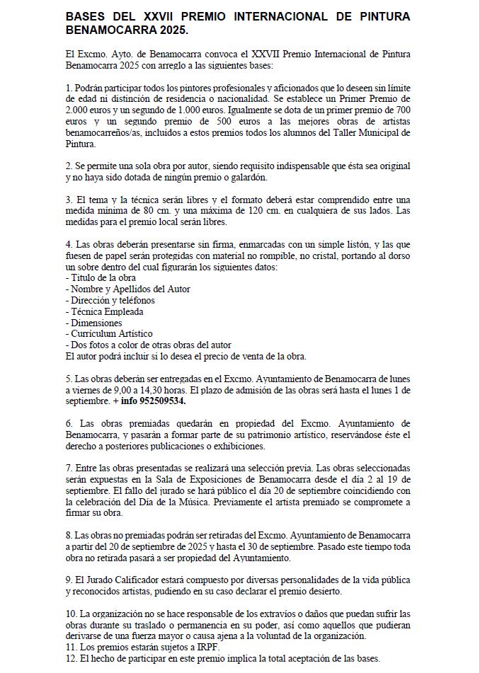 5. Las obras deberán ser entregadas en el Excmo. Ayuntamiento de Benamocarra de lunes a viernes de 9,00 a 14,30 horas. El plazo de admisión de las obras será hasta el lunes 1 de septiembre. + info 952509534.