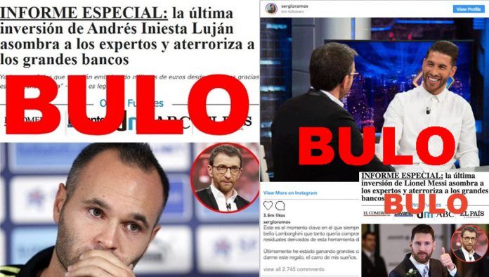 Tampoco es cierto, ni ha hecho esa recomendación ni es un artículo real de la cadena norteamericana. Además, este falso artículo también incluye una publicación de Instagram falsa de Sergio Ramos en la que aparece en una foto real junto al presentador de El Hormiguero, Pablo Motos, y en cuyo pie de foto se asegura que consiguió comprarse un Lamborghini con Bitcoin Trader.