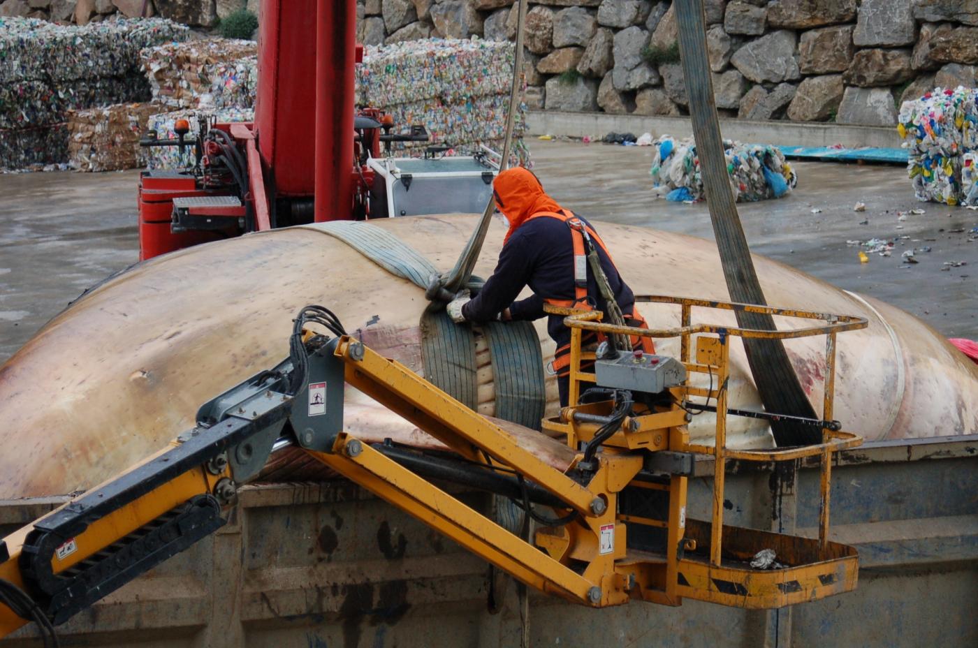 Una vez allí se han dispuesto todos los medios para trasvasar la ballena a un camión específico con tracción 8×8 que pudiera subirlo al vaso de vertido para lo que ha sido necesario el uso de una grúa pluma, varias palas, excavadoras y buldóceres y donde, posteriormente, se ha cubierto con tierra por completo.