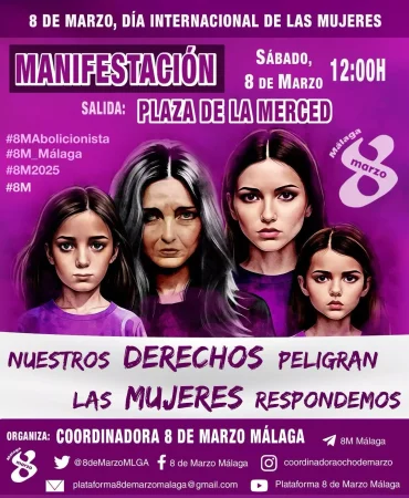 Bajo el lema «Nuestros derechos peligran, las mujeres respondemos», la marcha, organizada por la Coordinadora 8 de marzo Málaga, partirá a las 12:00 horas de la plaza de la Merced. Discurrirán por la calle Alcazabilla, calle Císter, Molina Lario, plaza de la Marina y finalizar en Plaza de la Constitución con la lectura del tradicional manifiesto.