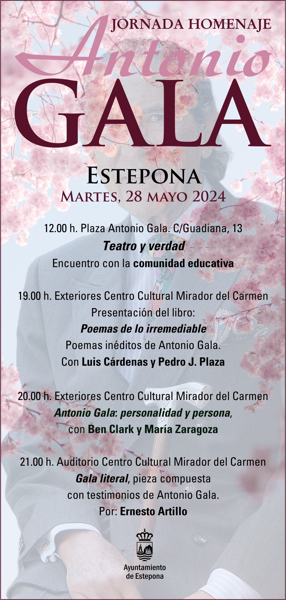 La jornada continuará en la zona exterior del Centro Cultural Mirador del Carmen, en el anfiteatro, donde se presentará el libro ‘Poemas de lo irremediable’, con poemas inéditos de Antonio Gala. El acto dará inicio a las 19:00 horas, con Luis Cárdenas, secretario personal de Antonio Gala durante casi treinta años, y Pedro J. Plaza, escritor e investigador. En 2021, ganó el Premio Málaga de Investigación por su ensayo ‘El poeta y el caleidoscopio: Lecturas múltiples en «El poema de Tobías desangelado», de Antonio Gala’.