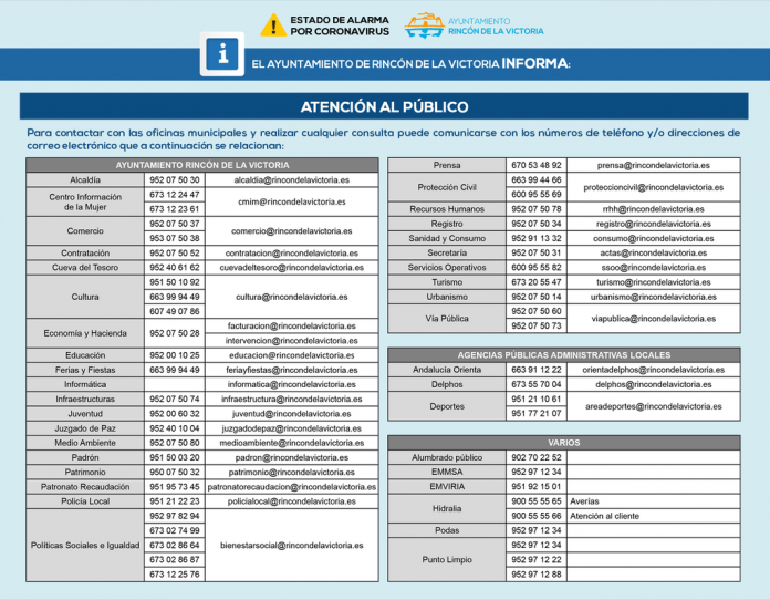 Por último, la edil ha querido recordar que los ciudadanos continúan disponiendo de la plataforma del Registro de Entrada Telemático en la sede electrónica municipal ( https://sede.rincondelavictoria.es ) para facilitar la presentación de documentos y realizar trámites. Se recomienda a la ciudadanía que priorice la atención telefónica y telemática mientras permanezca el estado de alarma.
