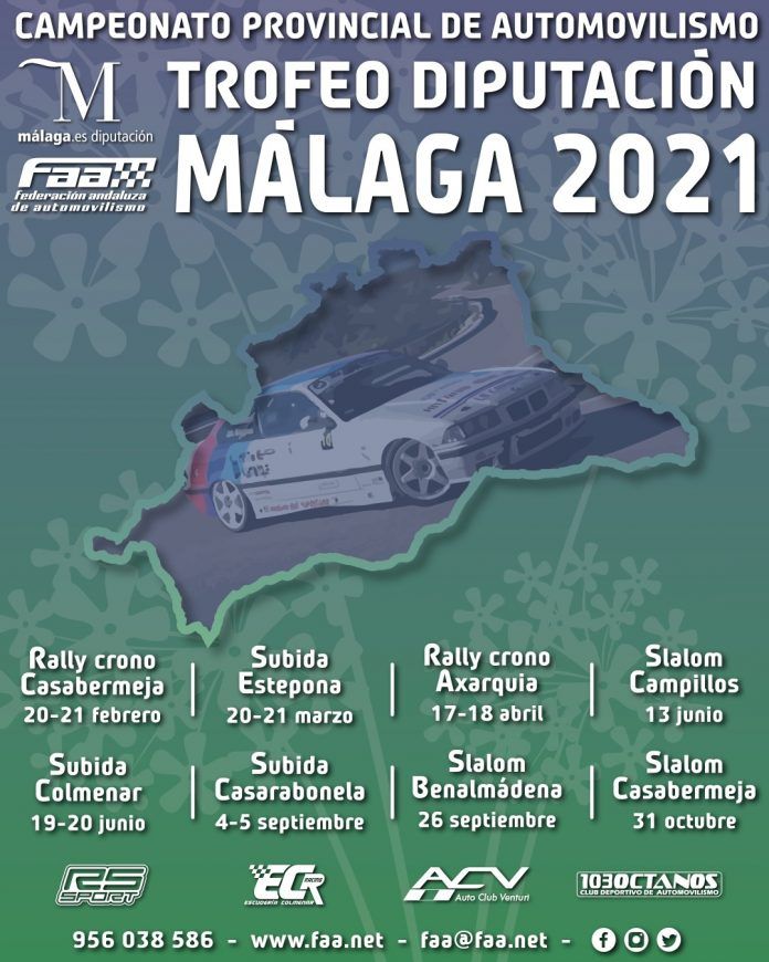 El circuito empieza este domingo, 21 de febrero, con el Rally Crono en Casabermeja; el 21 de marzo será la Subida a Estepona; el 18 de abril, el Rally Crono Axarquía, en Periana; el 13 de junio, el Slalom Campillos; el 20 de junio, la Subida a Colmenar; el 5 de septiembre, la Subida a Casarabonela; el 26 de septiembre, el Slalom Benalmádena, y el 31 de octubre finaliza con la modalidad de slalom, de nuevo, en Casabermeja.