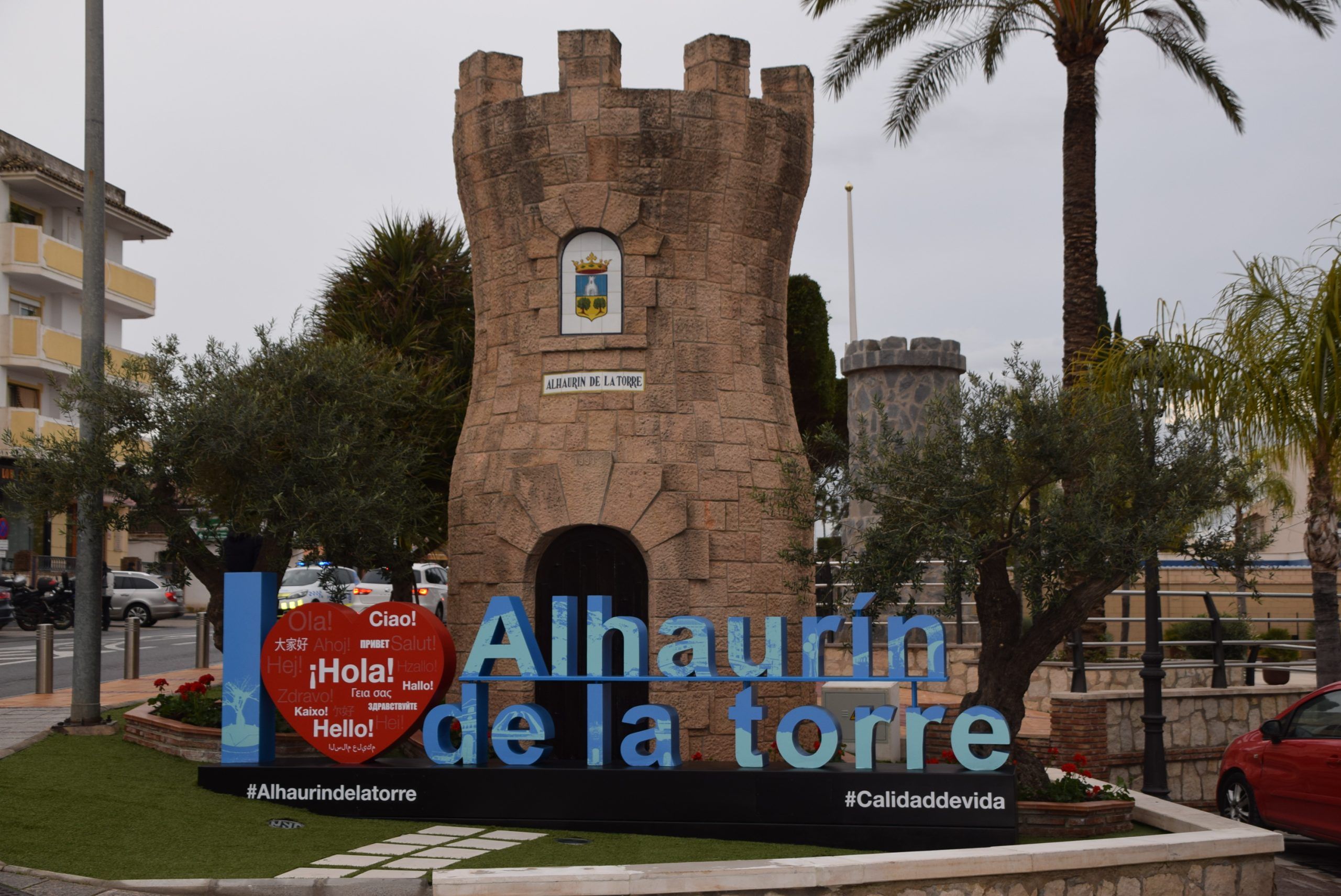 El letrero repite el formato letras más un corazón que sustituye a la palabra ‘love’ en inglés o ‘amo’ en castellano. Así, se puede leer como ‘Yo amo Alhaurín de la Torre’, además de la palabra ‘hola’ en varios idiomas, como guiño a los turistas.