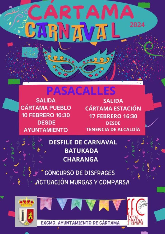 El Carnaval se celebrará el día 10 de febrero en Cártama Pueblo y dará comienzo a las 16.30 horas con un gran pasacalles que saldrá desde la Casa Consistorial. Toda la ciudadanía disfrazada recorrerá las calles del casco urbano y terminará en la Plaza de la Constitución, donde se celebrará el tradicional concurso de disfraces. A las 18.30 horas, en el escenario, actuarán la comparsa “El Circo del Sol” y la murga “La cuenta, que nos vamos”.