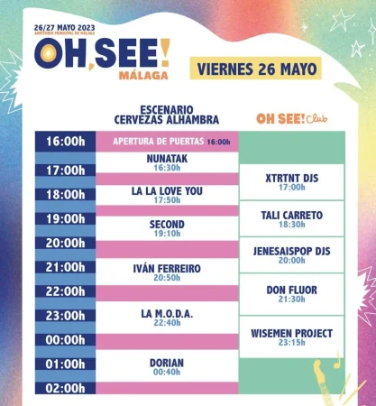 Entre medias no hay momento para el descanso porque en el Oh See! Club tocan XTRTNT Djs a las 17:00, Tali Carrero a las 18:30, Jenesaispop Djs a las 20:00, Don Fluor a las 21:30 y Wisemen Project a las 23:15.
