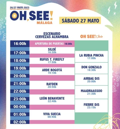 En el Oh See! Club el sábado estarán La Rubia Pincha a las 17:00, Don Gonzalo a las 18:30, Airbags DJS a las 20:00, Maadraassoo a las 21:30 y Fiebre DJS a las 23:15.