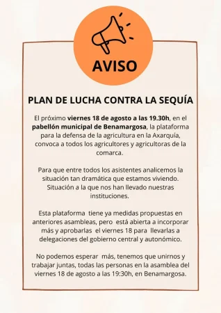 Esta entidad, creada a principios de julio con regantes de la comarca, asociaciones agrarias y administraciones locales, convoca a todos los agricultores de la Axarquía para reclamar «soluciones urgentes» a la falta de agua y apostar por impulsar con mayor rapidez las aguas regeneradas y la desaladora. La convocatoria de esta asamblea de protesta será a las 19.30 horas en el Pabellón Municipal de Benamargosa.