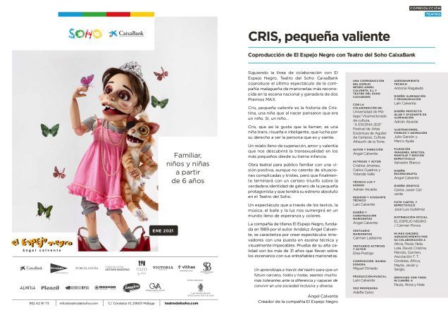 El espectáculo familiar CRIS, pequeña valiente se estrena hoy en el Soho a las 12 horas. En la temporada teatral anterior Teatro del Soho CaixaBank programaba un Especial El Espejo Negro con sus espectáculos más representativos que lamentablemente se vieron truncados por la pandemia. Por ello y siguiendo la línea de colaboración con El Espejo Negro, Teatro del Soho CaixaBank acordó coproducir el último montaje de la compañía malagueña de marionetas más reconocida en la escena nacional y ganadora de dos Premios MAX.