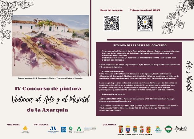 El cuarto concurso de pintura ‘Ventanas al arte y al moscatel’ establece tres premios: el primero o Territorio Sipam, dotado con 2.000 euros; el segundo Gusto del Sur, con 1.500 euros; y un premio especial del público Sabor a Málaga, dotado con 1.000 euro. Este galardón será decidido por el público que depositará su voto con el nombre de la obra elegida mientras las obras estén expuestas en cada municipio, ya que la muestra será itinerante y se podrá visitar durante las fiestas locales.