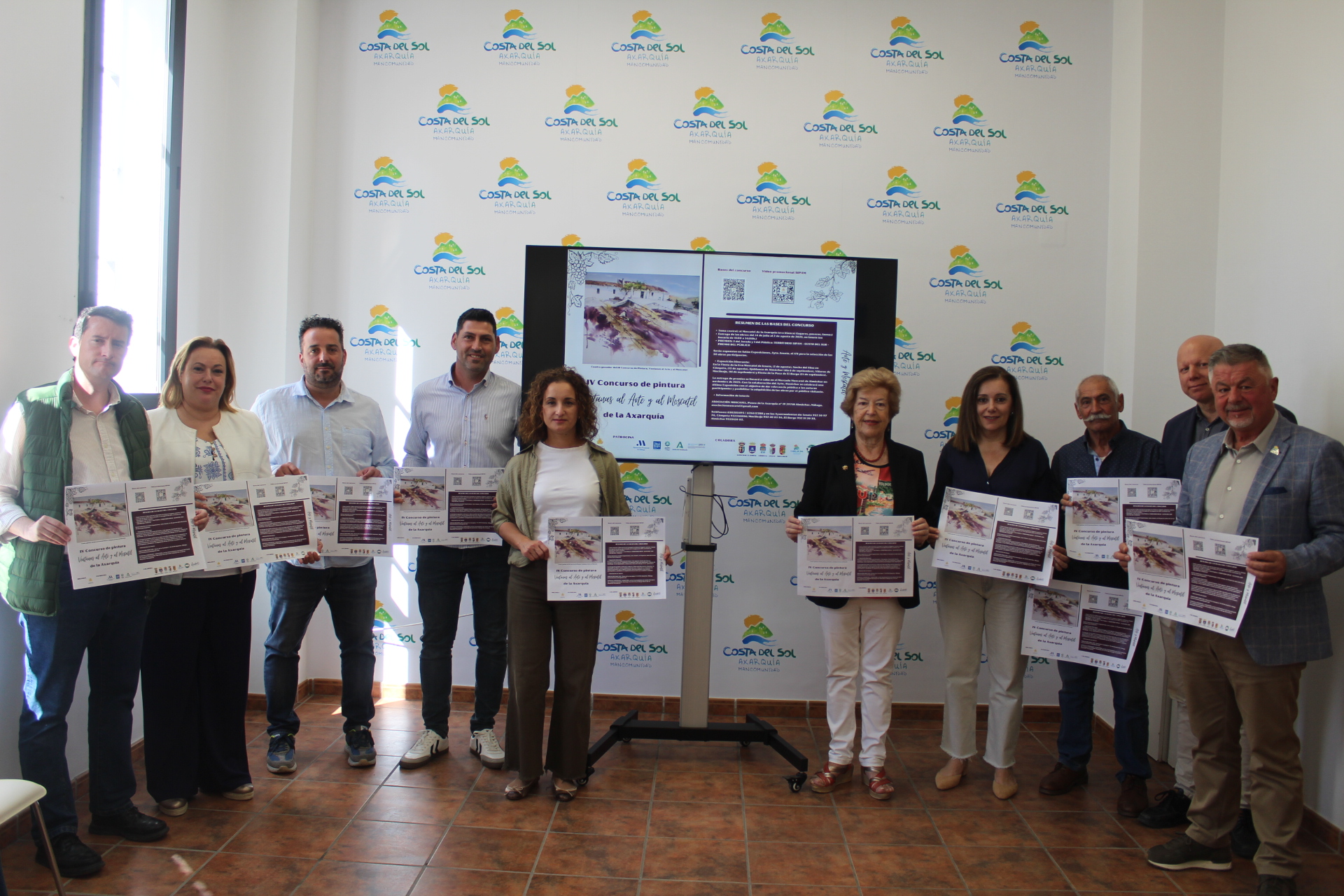 El presidente de la Mancomunidad de Municipios de la Costa del Sol Axarquía, Jorge Martín; el representante de la delegación de Agricultura, Pesca, Agua y Desarrollo Rural, Sergio Gil; la portavoz de la Asociación Moscatel, Josefa Gálvez, y artista y miembro del jurado José Casamayor han presentado esta mañana la cuarta edición del concurso de pintura «Ventanas al arte y al moscatel» dedicado a la uva pasa de la Axarquía. En el acto también han participado la alcaldesa de Cómpeta, Rosa Luz Fernández; las tenientes alcalde de El Borge, Soraya Alarcón y de Iznate, Mercedes Gallardo; los concejales de Almáchar, José Manuel Palma y de Moclinejo Pedro Blanco.