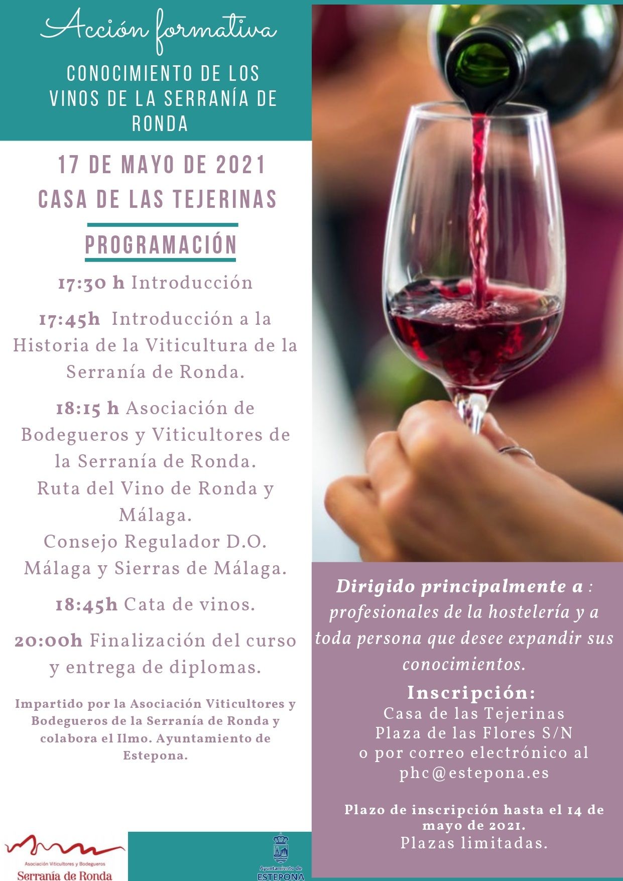 La actividad va dirigida, principalmente, a profesionales de la hostelería, y también a todas aquellas personas que deseen ampliar sus conocimientos acerca de los vinos de Ronda, tanto si ya poseen nociones sobre la materia, como si desean ampliarlos. La inscripción es gratuita, con participación limitada al aforo, y se podrá realizar hasta el 14 de mayo en la delegación de Patrimonio Histórico, sita en la Casa de las Tejerinas, Tfno.: 952809000 Ext-1049, ó por correo electrónico: phc@estepona.es