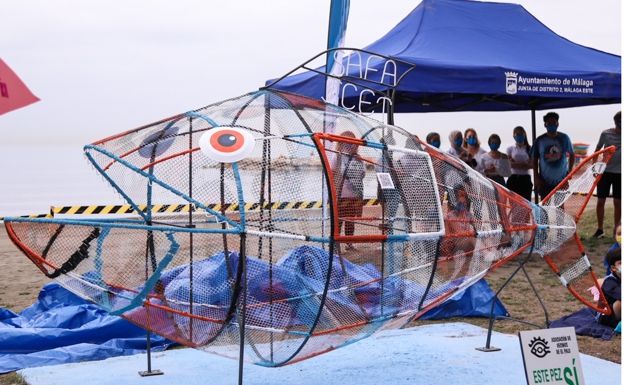 La escultura que representa un pez con el mensaje “Este pez SÍ come plástico” luce desde hoy en el paseo marítimo de El Palo con el objetivo de fomentar la concienciación ciudadana e incidir en que cada plástico que se deja en la playa acaba en el mar. Esta mañana se ha procedido a la colocación de dicha obra en calle Quitapenas 69, elaborada por alumnos de las Escuelas Profesionales SAFA- ICET.
