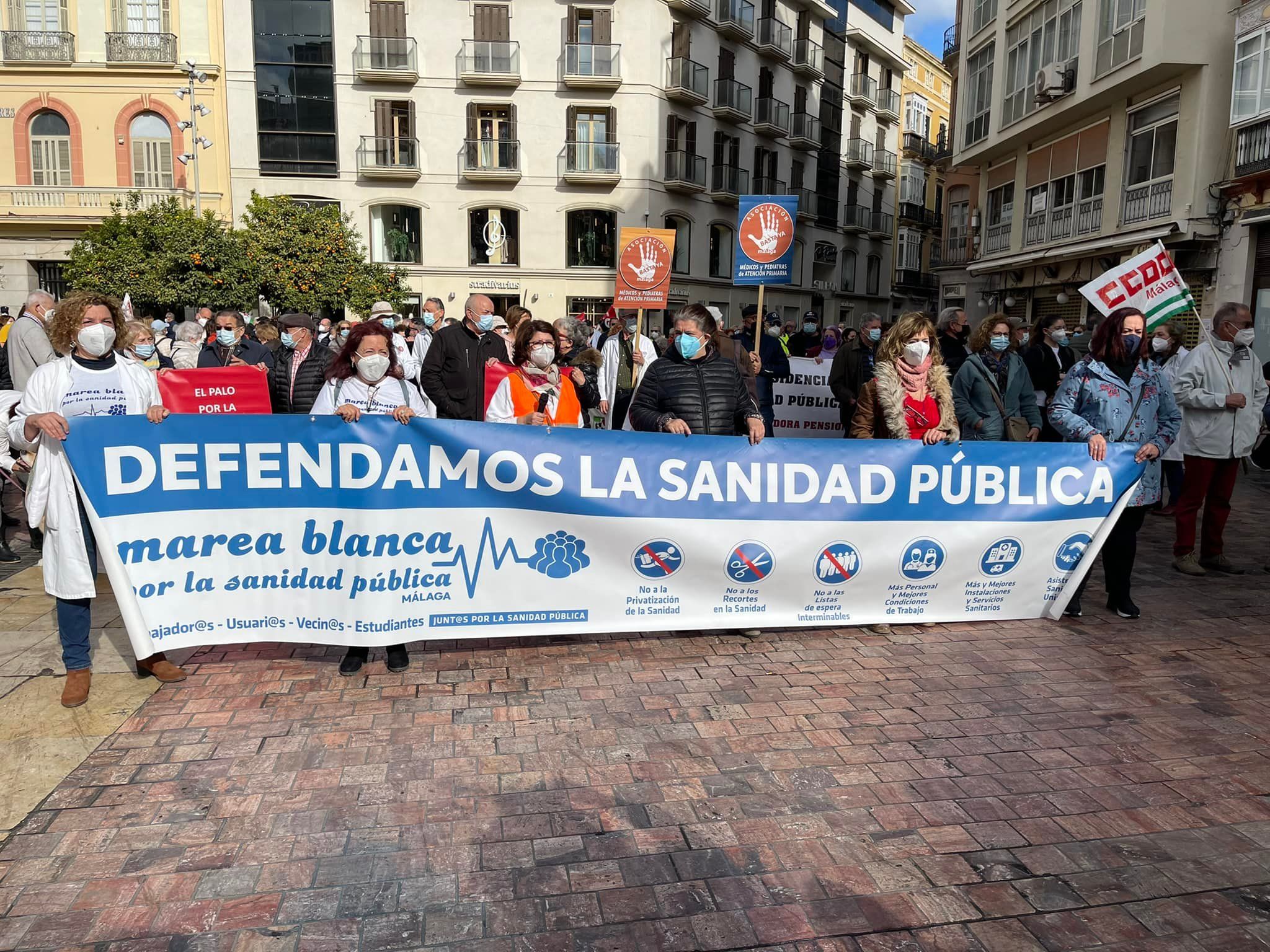 Unas cuatrocientas personas, según la Policía, han participado este sábado en Málaga en una manifestación convocada por la Marea Blanca por la Sanidad Pública, en la que se ha reclamado que el 7 por ciento del PIB se destine a las políticas sanitarias y que las consultas vuelvan a ser presenciales.