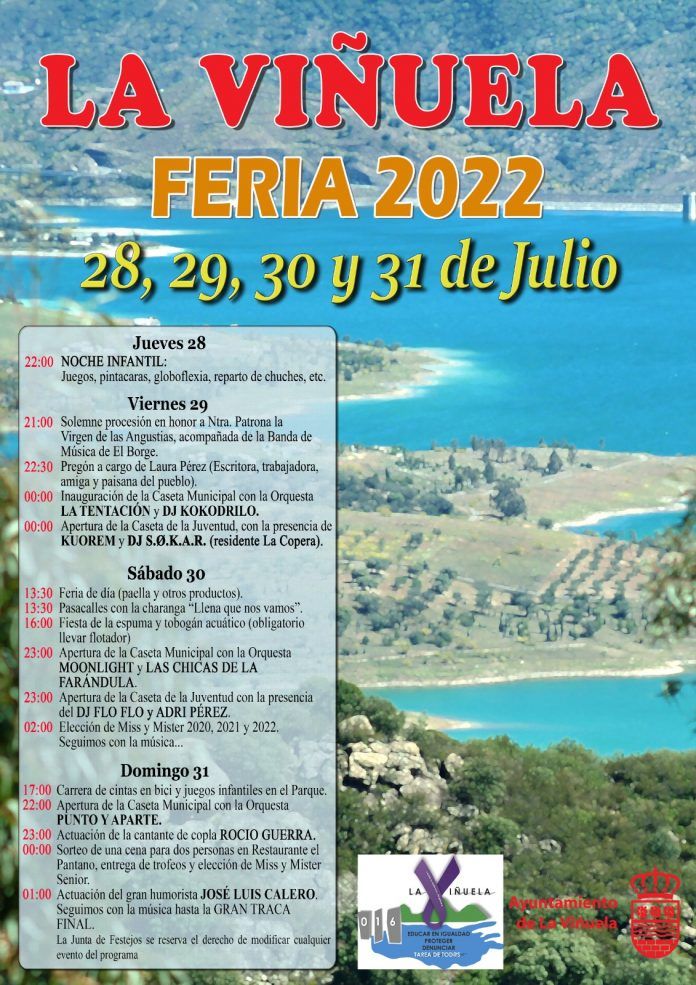 A partir del jueves 28 de julio, La Viñuela vivirá la Feria 2022. Serán los más pequeños los primeros en disfrutarla ya que el Ayuntamiento ha dispuesto para este día la «Noche Infantil». Durante la jornada podrán disfrutar de juegos, pintacaras, globoflexia y reparto de chuches, entre otras sorpresas y actividades. Para los mayores, a lo largo de estos cuatro días, se han dispuesto cuatro orquestas diferentes, y varias actuaciones de música y humor.