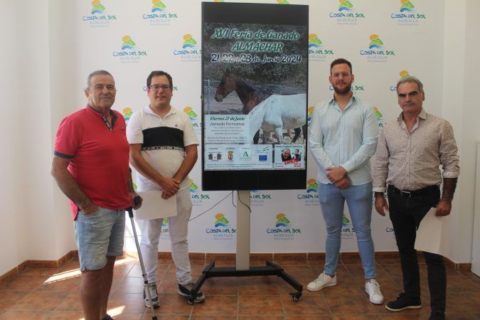 El vicepresidente cuarto de la Mancomunidad de Municipios de la Costa del Sol Axarquía, responsable de Agricultura, Ganadería, Pesca y Desarrollo Rural; Francisco Ruiz, el teniente alcalde de Almáchar, Mario Torres y el representante de la Peña Amigos del Caballo de Almáchar, Juan Carlos Martín han presentado la XVI edición de la Feria del Ganado que comenzará mañana en el recinto de la romería y finalizará el domingo 23 de junio a mediodía..