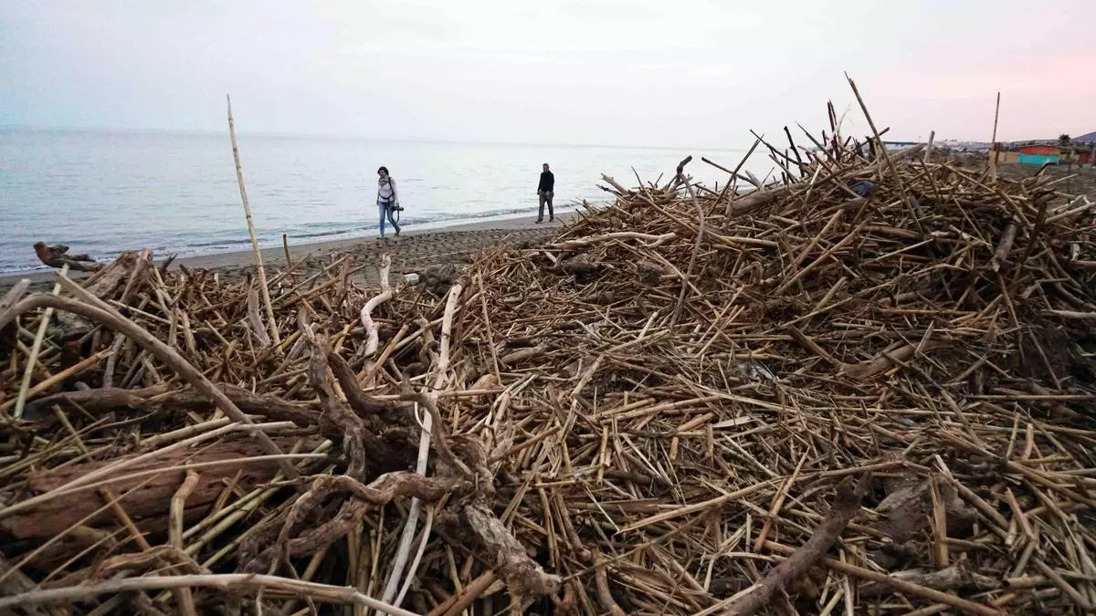 Las intensas lluvias de las últimas borrascas han vuelto a dejar una imagen ya habitual en el litoral de la Costa del Sol Occidental: playas cubiertas por toneladas de cañas y restos vegetales arrastrados desde ríos y arroyos hasta su desembocadura en el mar.