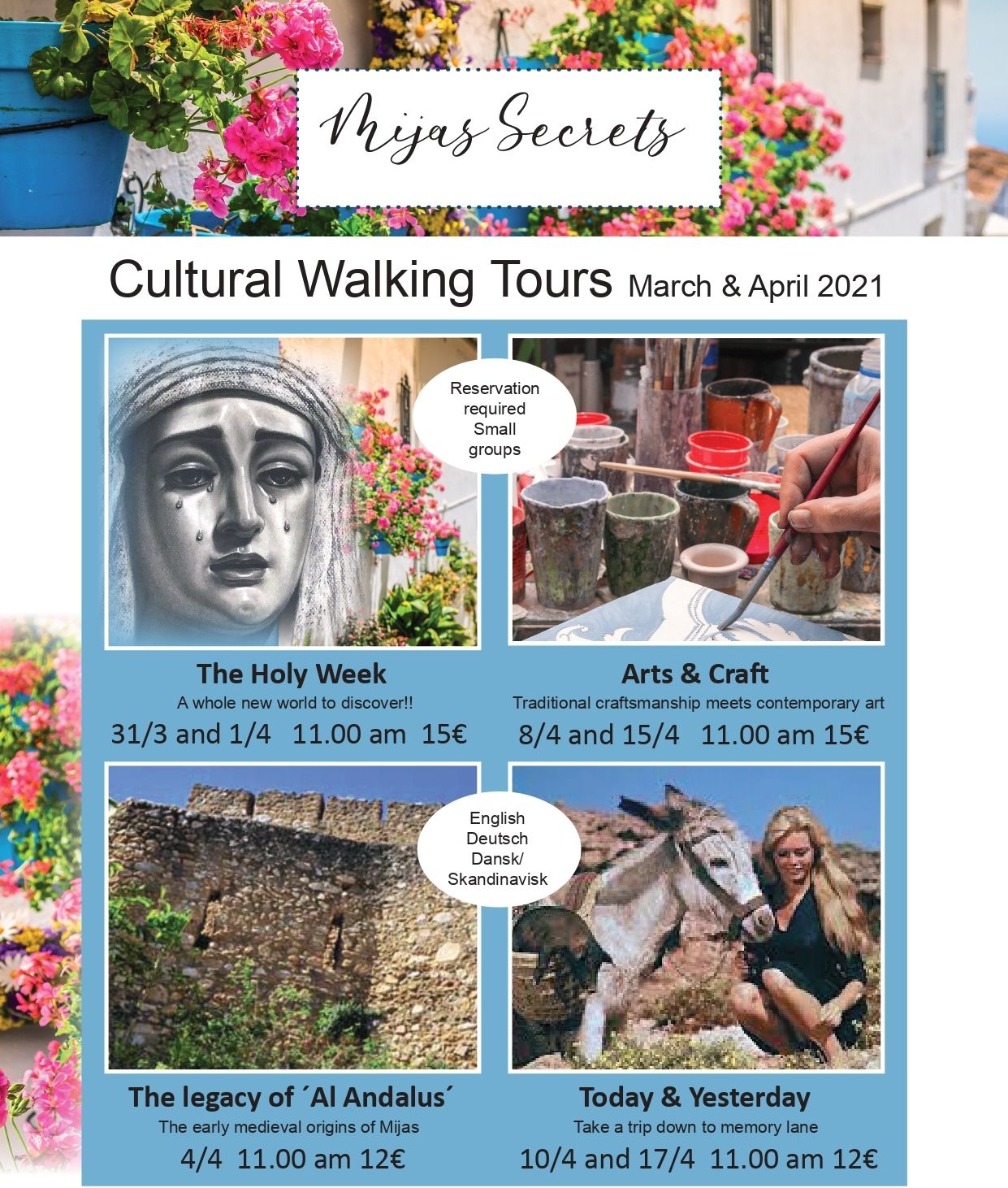 La edil ha informado que «estos tours se ofrecen en inglés, alemán y escandinavo en grupos reducidos que se irán actualizando acorde a las restricciones de la pandemia» a lo que añade que «el precio asciende entre 12 y 15 euros dependiendo de la actividad en cuestión y todas salen a las 11 de la mañana de la Oficina de Turismo de Mijas Pueblo con una duración aproximada de dos horas».