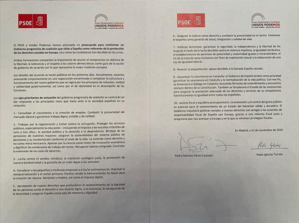Los líderes de PSOE y Podemos, Pedro Sánchez y Pablo Iglesias, han firmado un preacuerdo para formar un «gobierno progresista de coalición» que estará basado en la «lealtad» entre ambos partidos y que se plantea para un «gobierno estable de cuatro años», con Iglesias como vicepresidente.