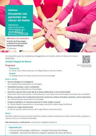 El Servicio de Ginecología y Obstetricia de Quirónsalud Málaga y la Asociación de Atención a Mujeres operadas de cáncer de Mama de Málaga (Assama) organizan este miércoles, a las 17.30 horas, un encuentro presencial y online para pacientes.