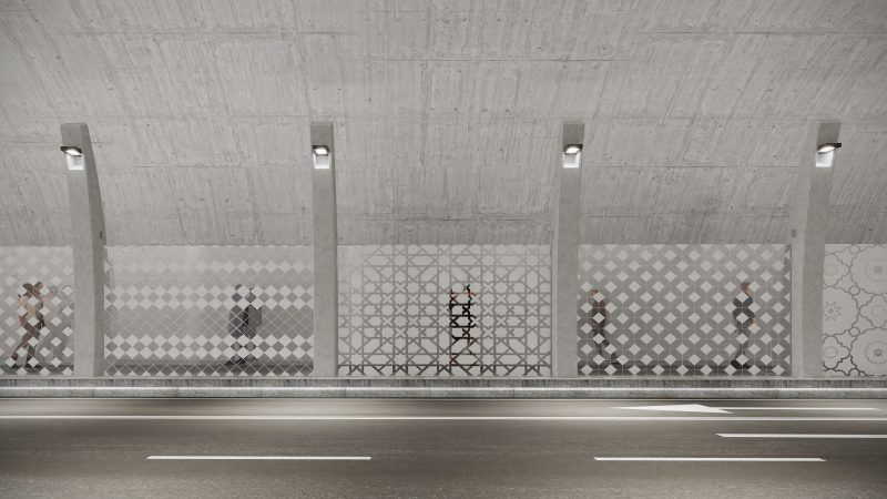 Así, el objetivo es construir unas galerías independientes sin perder la visión de la bóveda del túnel, que permitan al peatón circular por un espacio sugerente. Para ello, se proponen unas mamparas acústicas de vidrio laminar cosidas mediante unas costillas de hormigón, con serigrafías inspiradas en los frisos de la propia Alcazaba, que generan una semi transparencia entre peatón y vehículo.