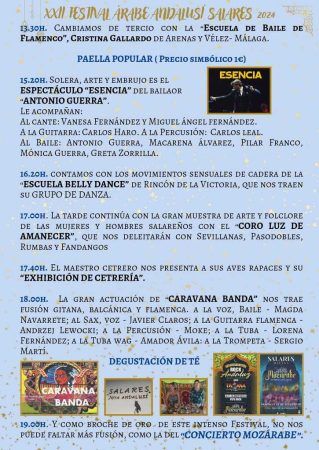 Para el almuerzo, habrá una paella popular al precio simbólico de un euro el plato. La tarde continuará con el espectáculo ‘Esencia’ del bailaor Antonio Guerra (15:20h), la Escuela Belly Dance (16:20h), el Coro ‘Luz de Amanecer’ (17h), exhibición de cetrería (17:40h) y los esperados conciertos de Caravana Banda (18h) y Mozárabe (19h), quienes llenarán de bailes y alegría con sus mezclas de estilo.