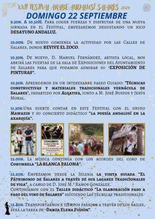 Para este sábado, 21 de septiembre, la programación se inició a las 09:30 horas con un desayuno popular, la presentación del libro ‘Salares, tras la huella andalusí’ y la apertura de la exposición de pinturas del artista local Manuel Fernández.