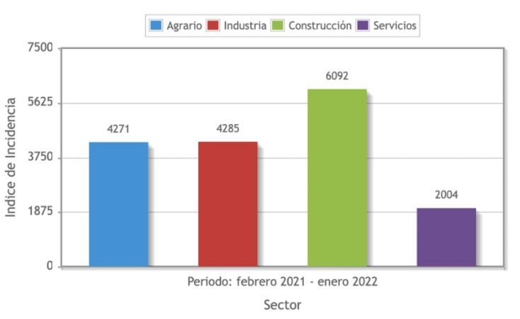 El sector de actividad con mayor índice de incidencia fue Construcción que supera en más del doble la media de los índices sectoriales. A continuación, se encuentra el sector Agrario seguido de cerca por el sector Industria, siendo ambos datos superiores a la media. Y por debajo de la media se sitúa el sector Servicios.