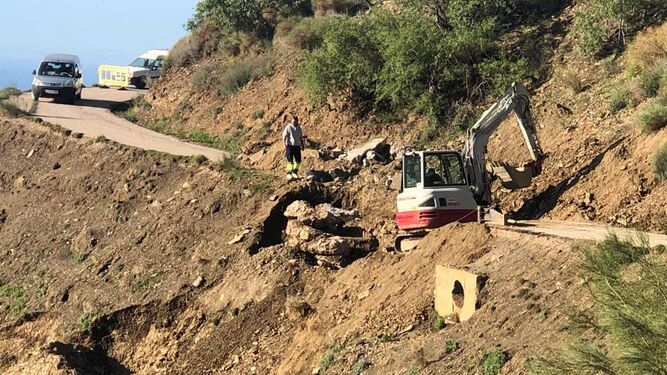 Un desprendimiento de tierra en Macharaviaya mantiene cortado desde el pasado domingo el único acceso por carretera al núcleo urbano de Vallejos y ha dejado a seis familias incomunicadas.