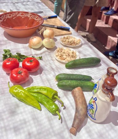 La fiesta empezó con un pasacalles de la escuela de música, hubo talleres repartidos por todo el municipio, sorteos, mercadillo artesanal, las mujeres ceramistas de Alfarnatejo vendiendo sus maravillosos cuencos,que se agotaron en una hora, y por supuesto la degustación del gazpacho de los tres golpes donde las interminables colas esperaban y se sirvieron casi mil litros de gazpacho mientras la fiesta estuvo amenizada por una orquesta que puso a bailar a los asistentes.