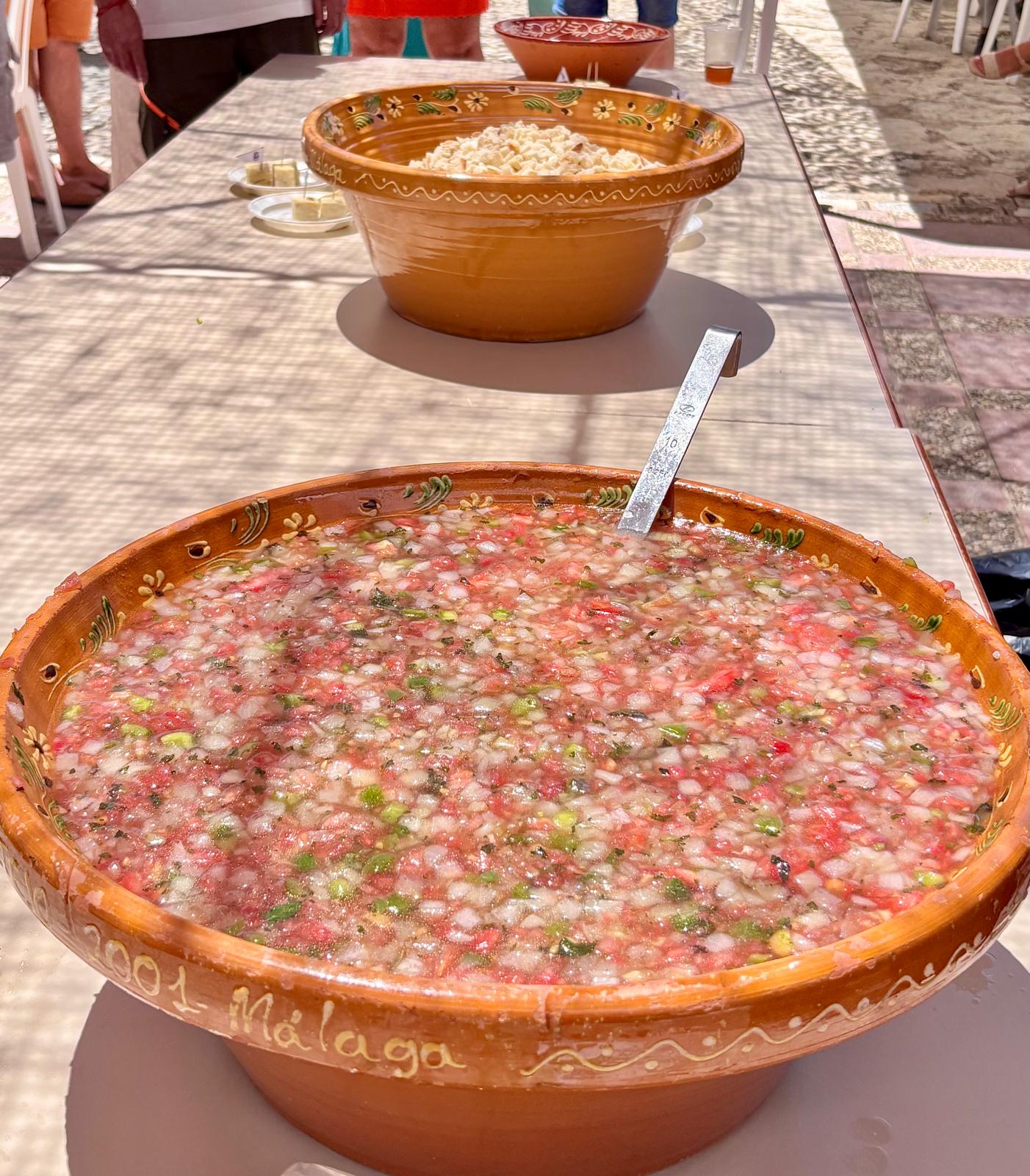 La fiesta empezó con un pasacalles de la escuela de música, hubo talleres repartidos por todo el municipio, sorteos, mercadillo artesanal, las mujeres ceramistas de Alfarnatejo vendiendo sus maravillosos cuencos,que se agotaron en una hora, y por supuesto la degustación del gazpacho de los tres golpes donde las interminables colas esperaban y se sirvieron casi mil litros de gazpacho mientras la fiesta estuvo amenizada por una orquesta que puso a bailar a los asistentes.
